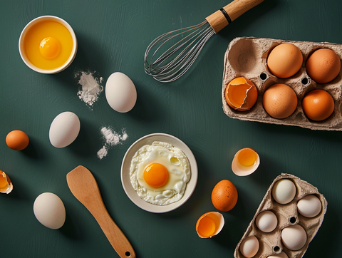 Eggs are the produce of chickens and ducks. Most commonly it is chicken eggs, which are sold and used in processed products. Eggs can come in many forms, boiled, poached, fried, scrambled and omelette. They are also used in baking, mayonnaise, custard, mousse, margarine, meringue and ice cream. Eggs can be separated into egg white and egg yolk, sometimes only part of the egg is used.